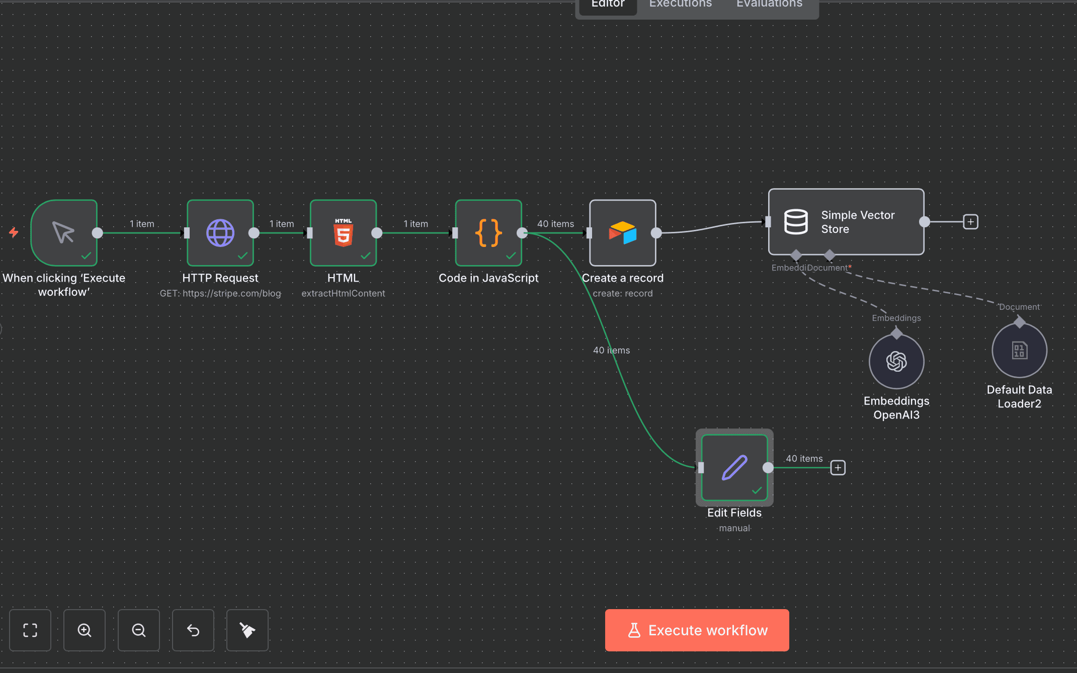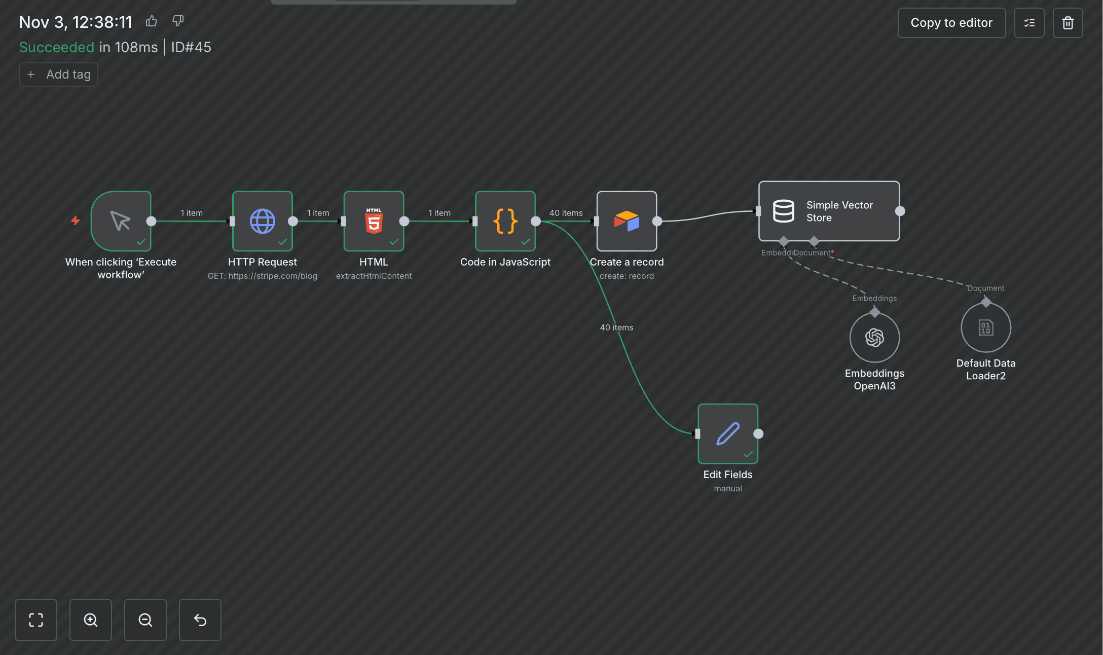 The workflow calls a public documentation URL to retrieve the raw HTML of a page. The workflow automatically converts live documentation into a structured, searchable knowledge base that can power: